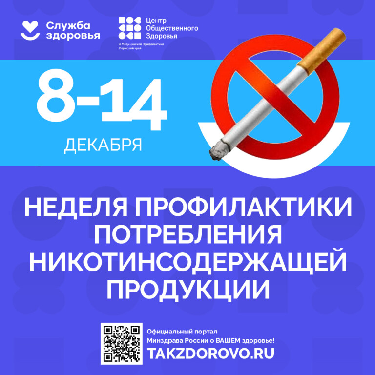 ГБУЗ ПК «Центр общественного здоровья и медицинской профилактики» информирует о проведении в период с 8 по 14 декабря 2025 года Недели профилактики потребления никотинсодержащей продукции