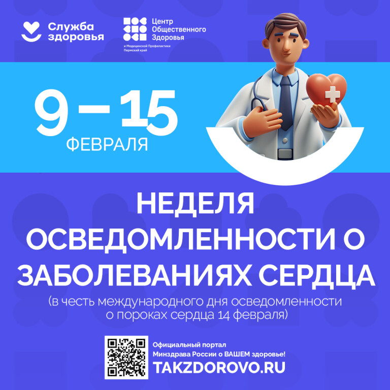 ГБУЗ ПК «Центр общественного здоровья и медицинской профилактики» информирует о проведении в период с 9 по 15 февраля 2026 года Недели осведомленности о заболеваниях сердца (в честь международного дня осведомленности о пороках сердца 14 февраля)
