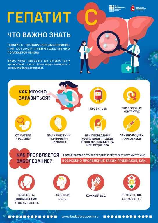 ГБУЗ ПК «Центр общественного здоровья и медицинской профилактики» информирует о проведении в период с 9 по 15 марта 2026 года Недели по борьбе с заражением и распространением хронического вирусного гепатита С