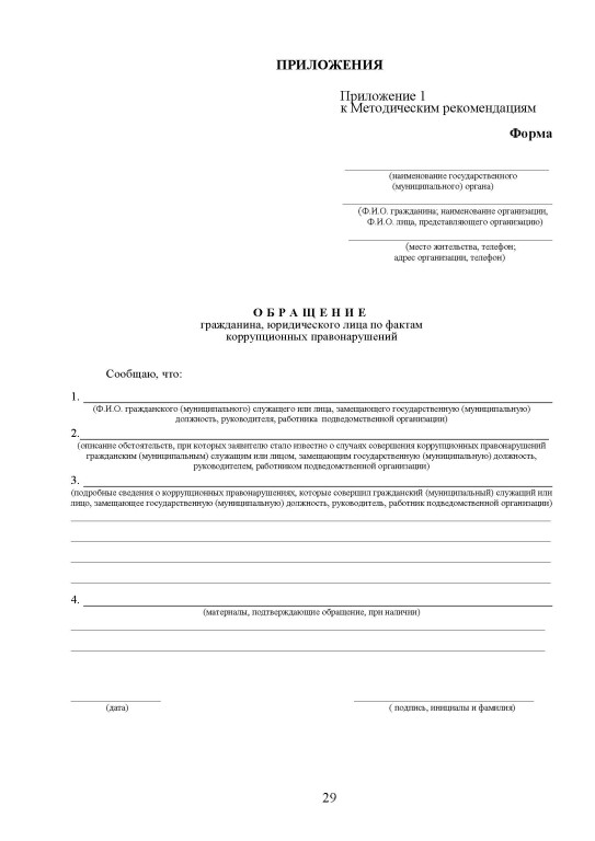 Обращение гражданина или организации по фактам коррупционных правонарушений - бланк